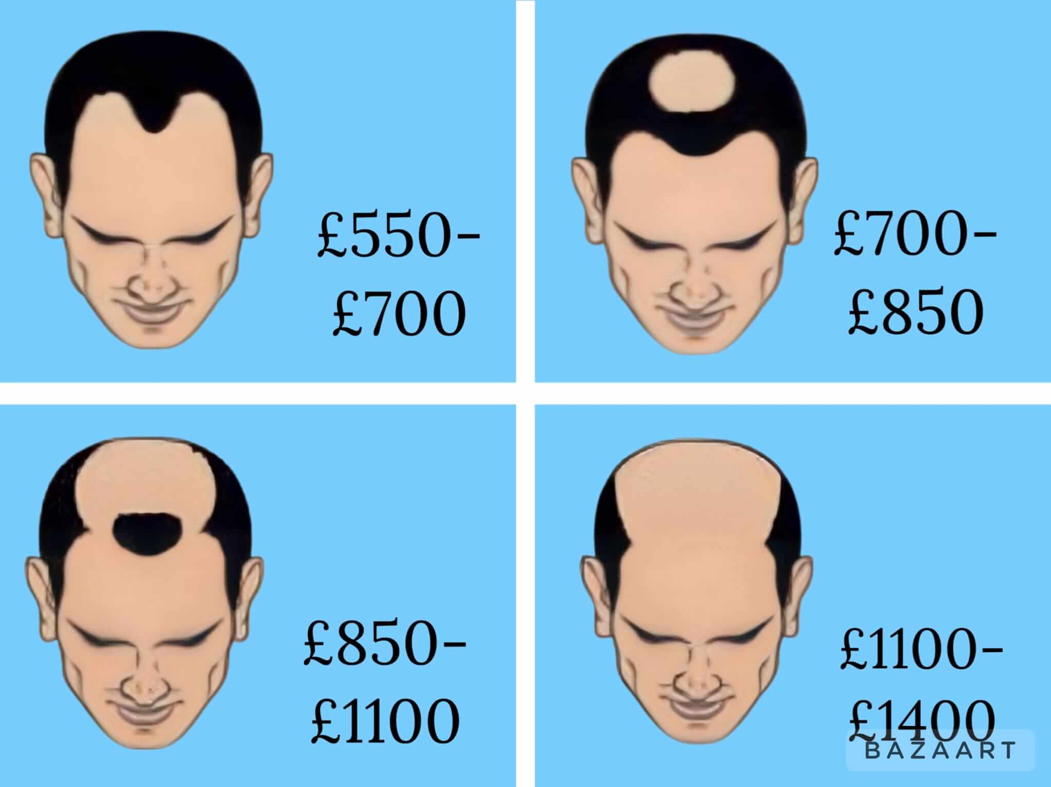 All treatments are 100% tailored to each client, no hair loss is the same, no skin is the same and each client has different requirements for the best outcome for them personally.As it isnt a one size fits all treatment, we price on a case by case basis but the pricing above will give you a guide. Simply send us photo’s and we will firm up your quote within 24 hours OR contact us to arrange a free consultation where we can assess, advise and provide a quote.